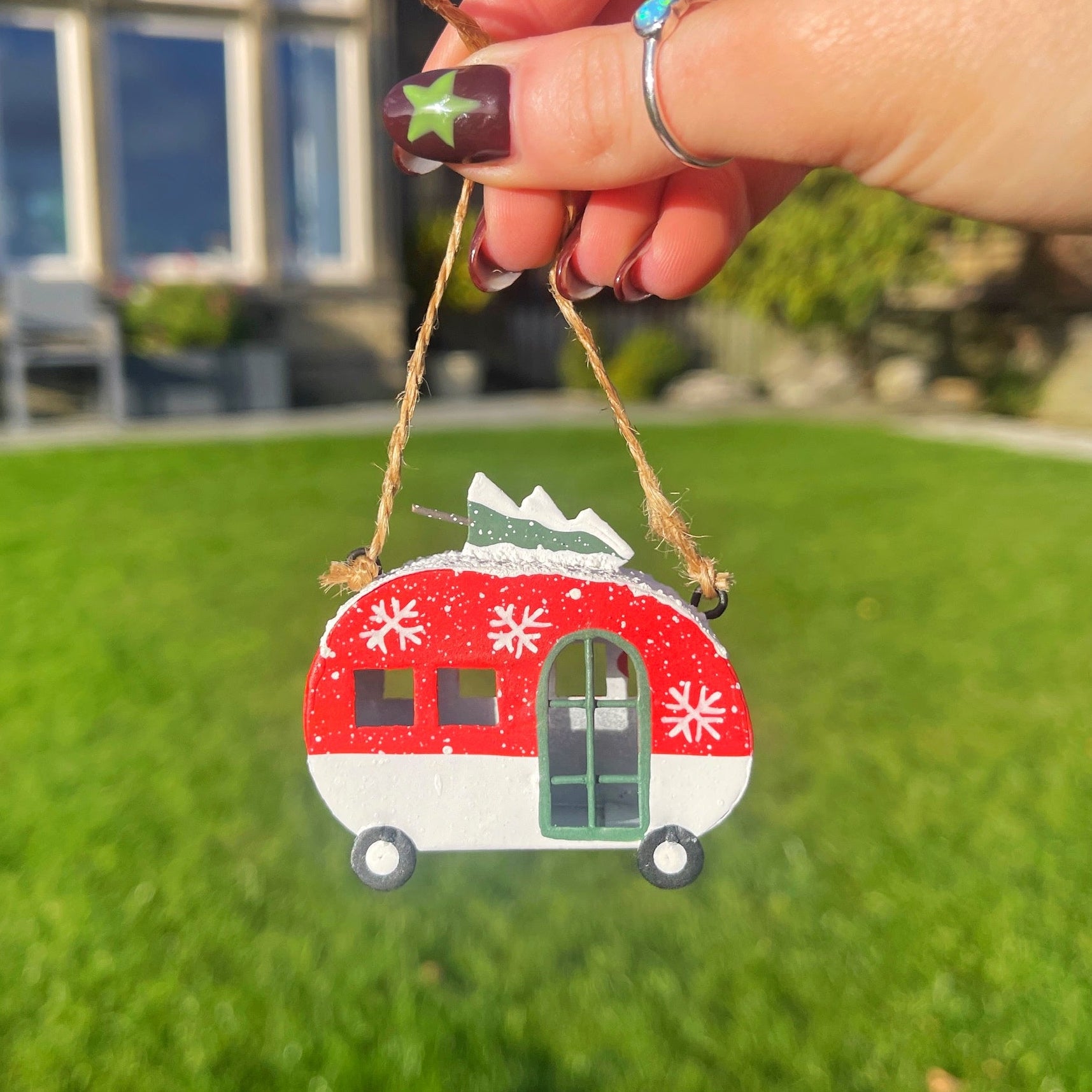 This charming handmade metal caravan decoration is full of nostalgic festive charm.
