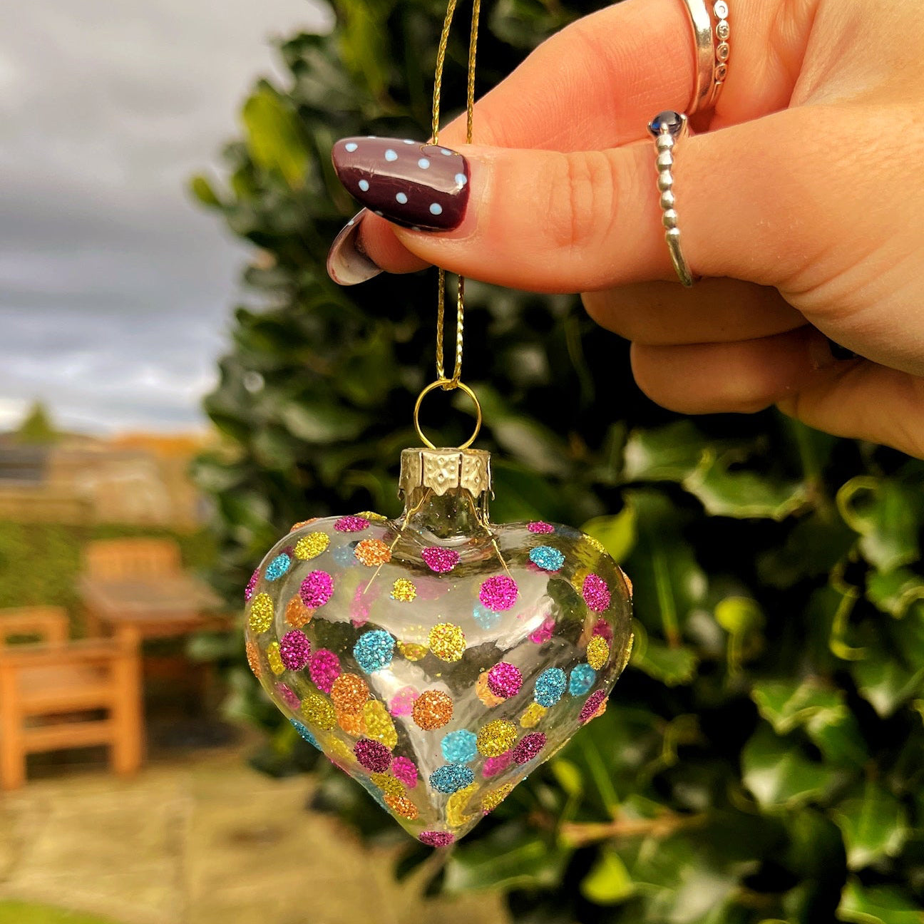 Christmas Glass Dotty Heart Bauble Set Brighten your tree with this delightful set of three glass heart baubles, each decorated with colourful glitter dots for a fun and festive finish.