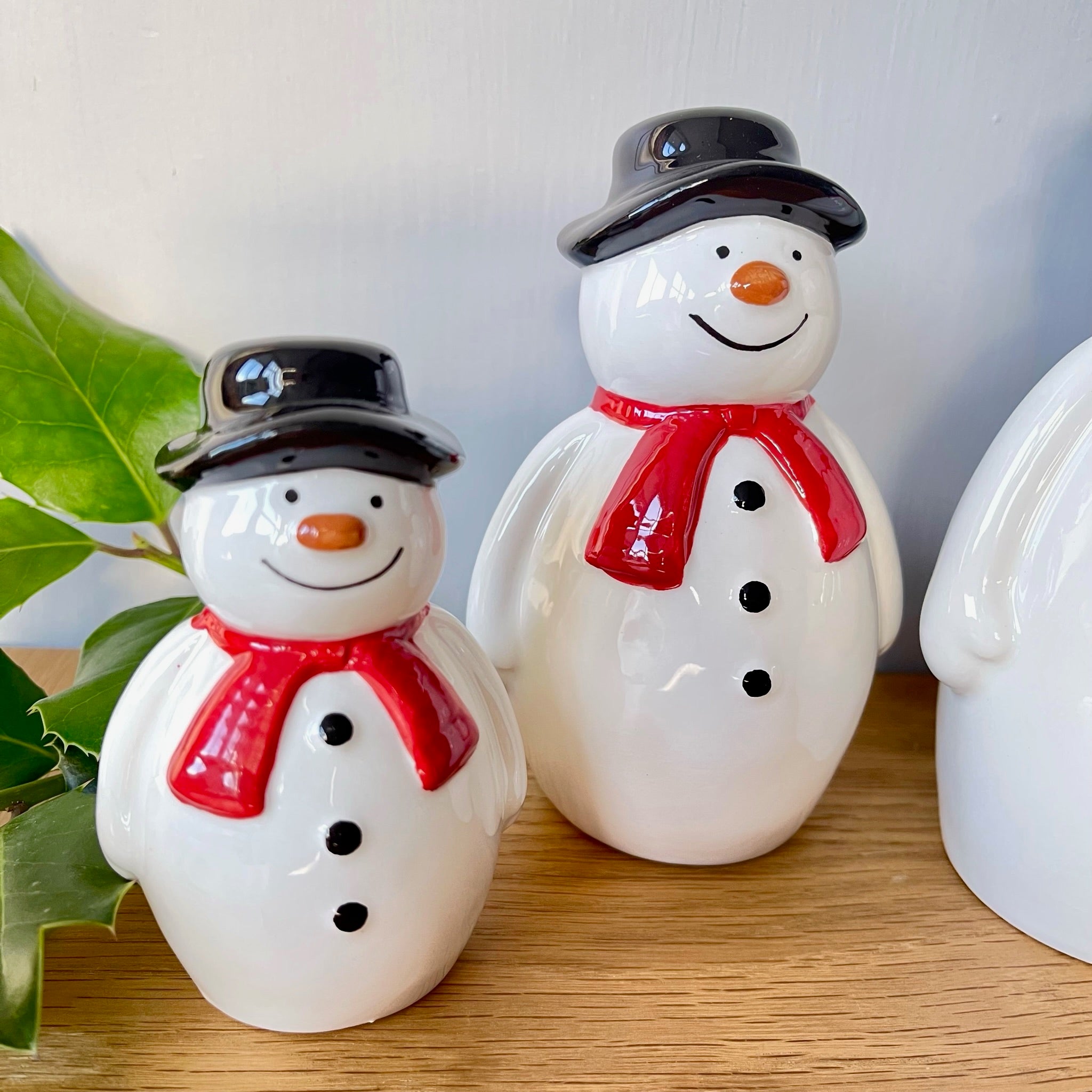 This adorable set of three snowmen make a perfect family and will look great this Christmas on a mantlepiece or shelf. They are all hand painted ceramic and are glazed with a shiny finish.