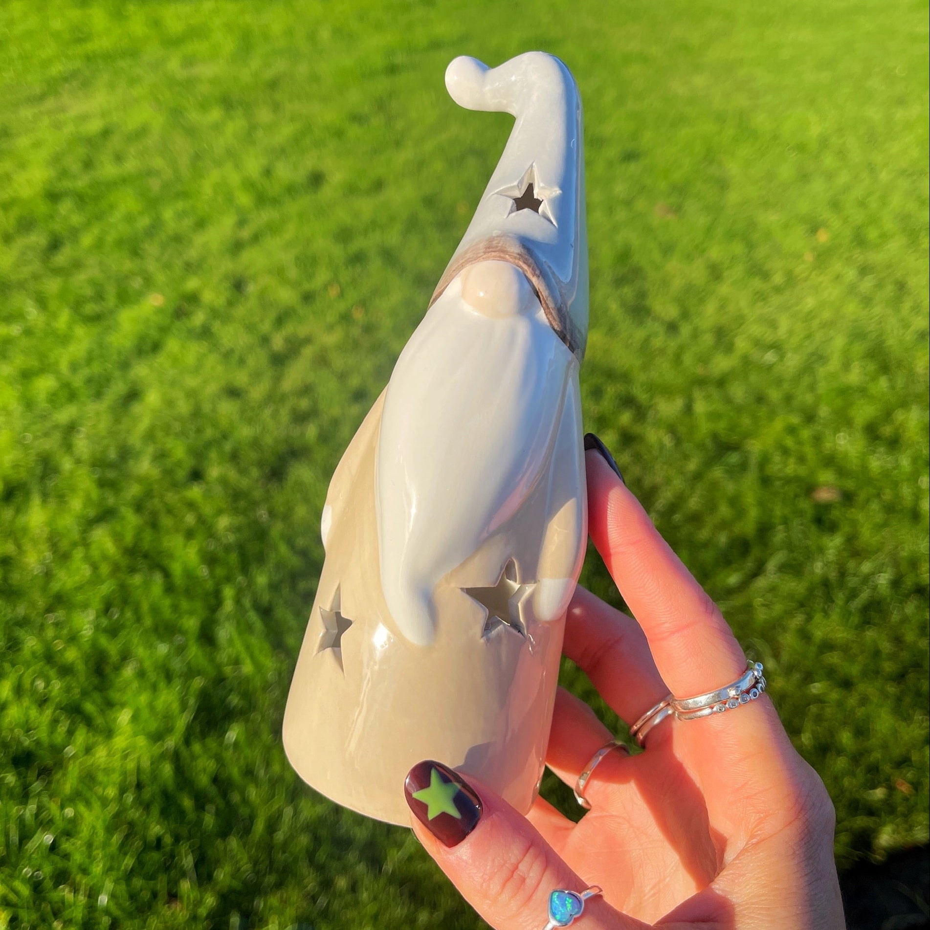 Ceramic gnome figurine with a gray hat and beige body on a wooden surface.
