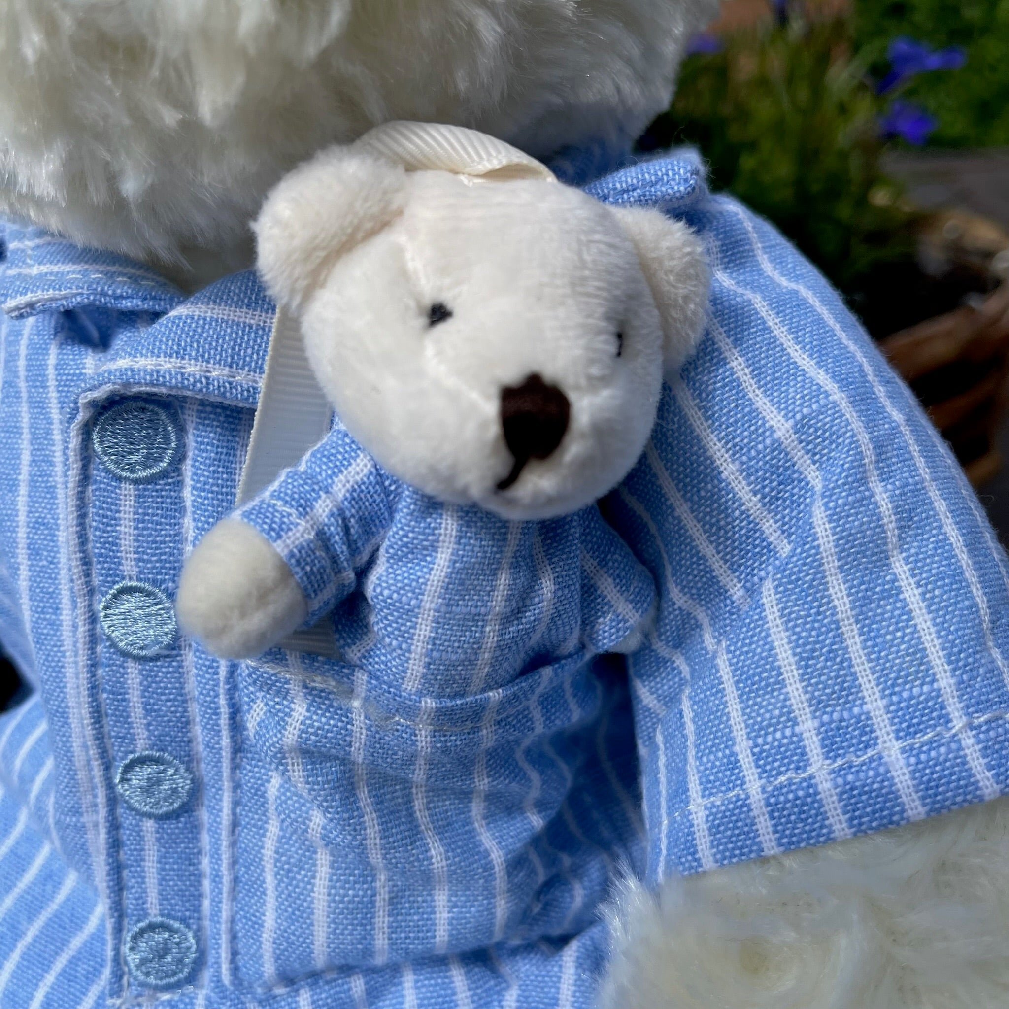 Dressed in blue striped pyjamas, he is perfect for cuddles, playtime, and imaginative adventures.