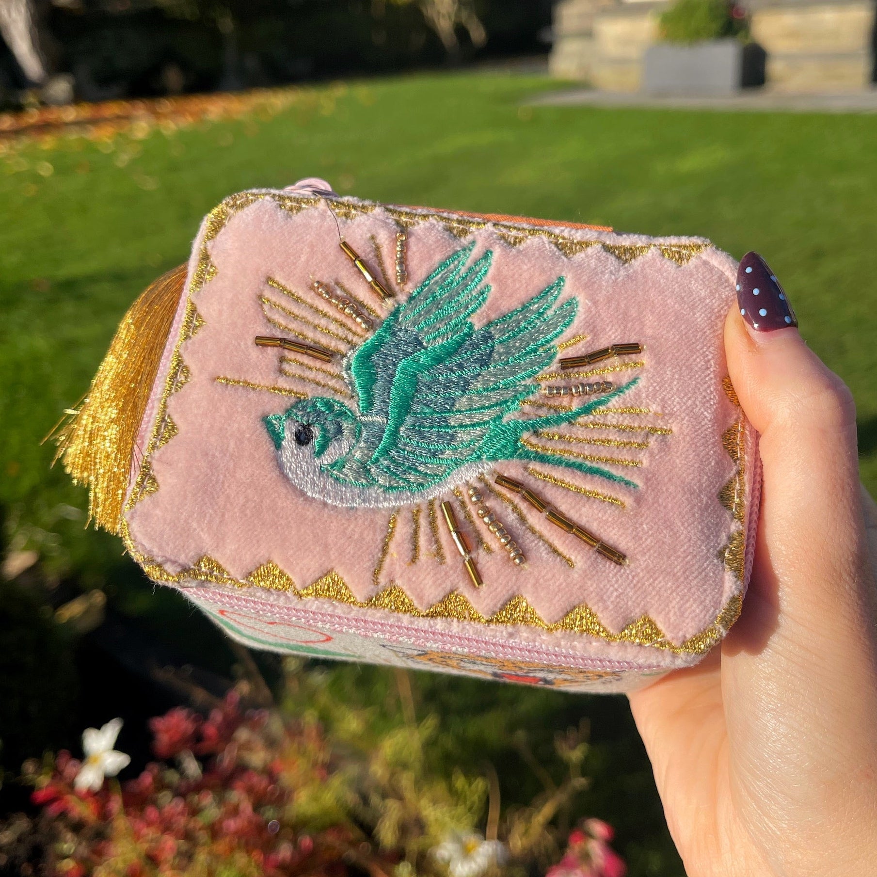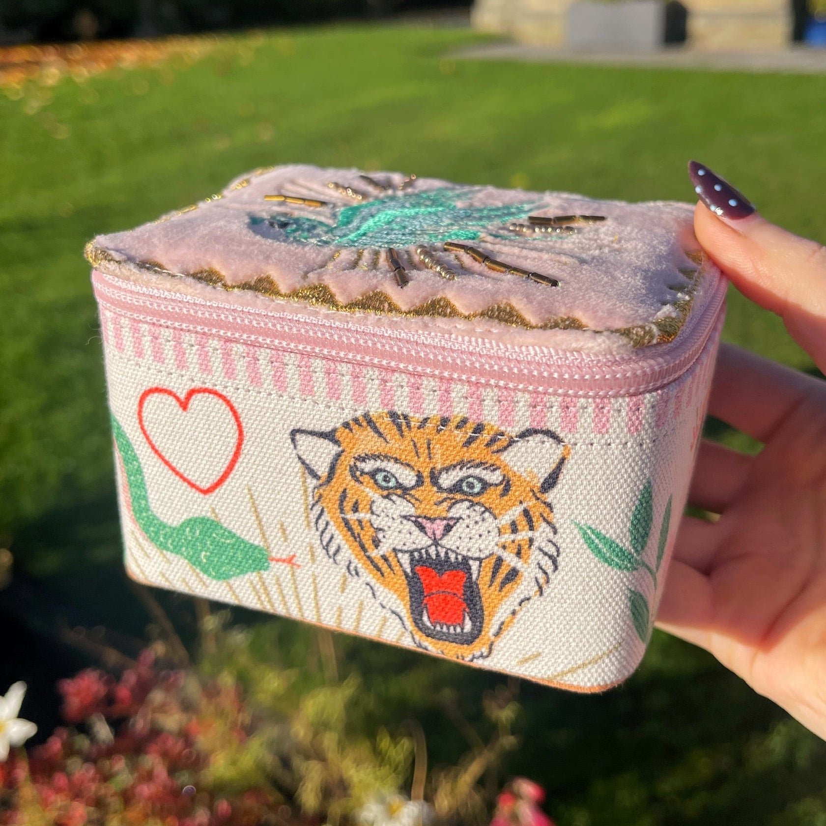 Crafted from soft pale pink velvet, it features bold, tattoo-inspired embroidery including a striking blue swallow on the lid, with a tiger, snake, and classic tattoo motifs adorning the sides.