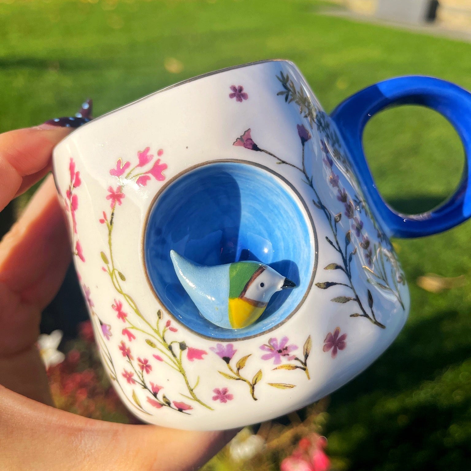 Crafted from high-quality ceramic, the mug features a charming 3D blue tit bird perched on the outside, adding a whimsical touch to your cup of tea or coffee.