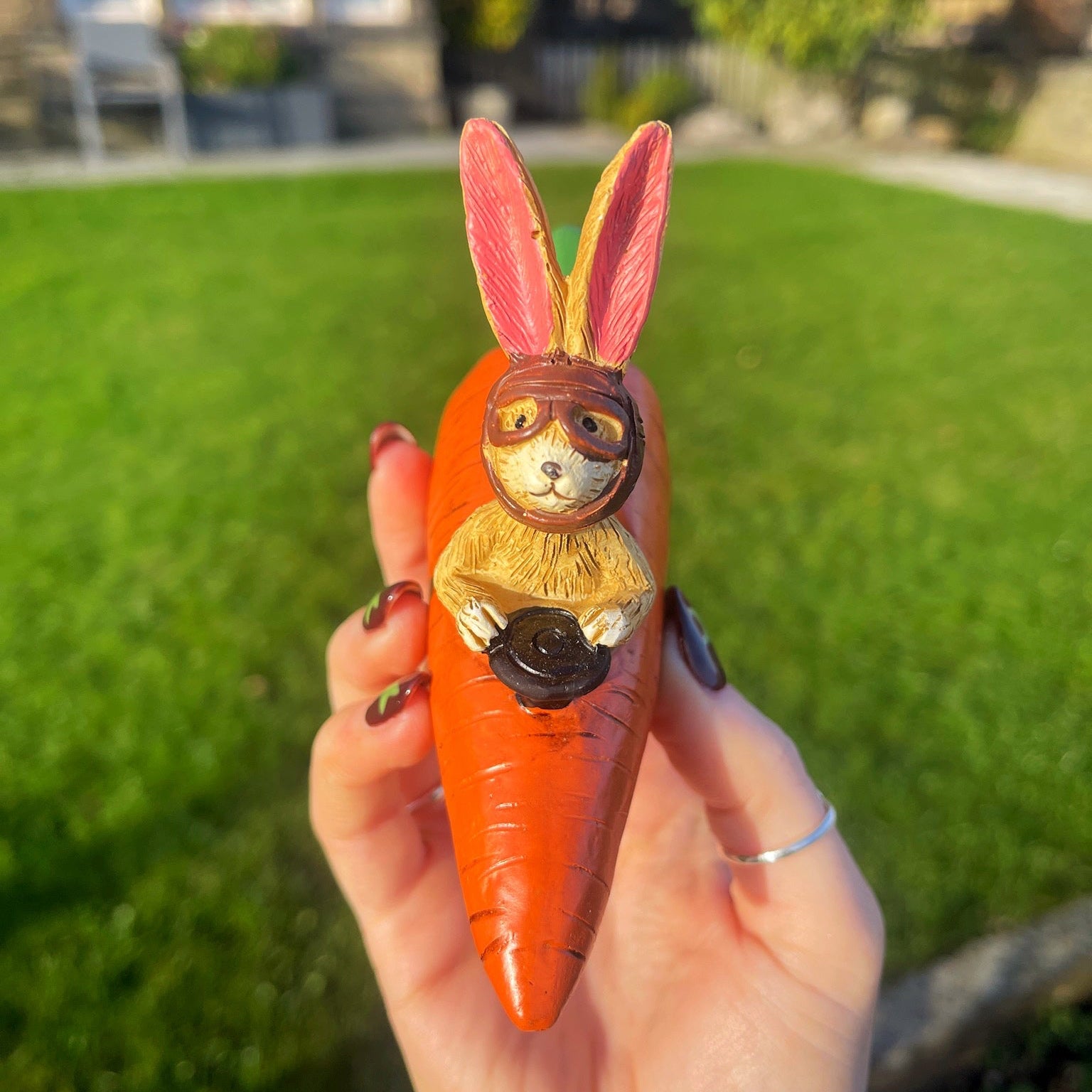 Full of charm and whimsy, this resin bunny riding in a carrot makes a delightful addition to spring décor, Easter displays, or gifts for animal lovers.