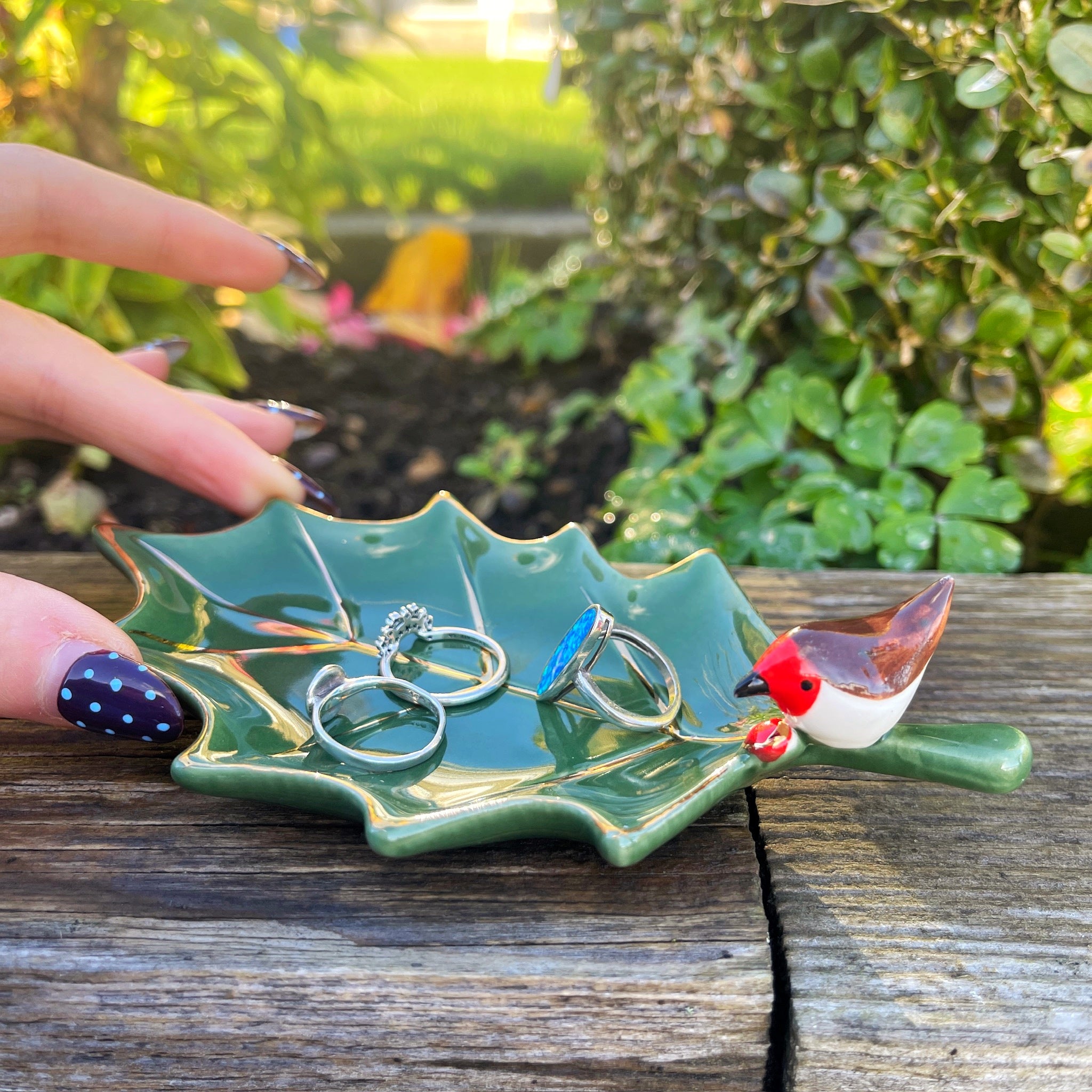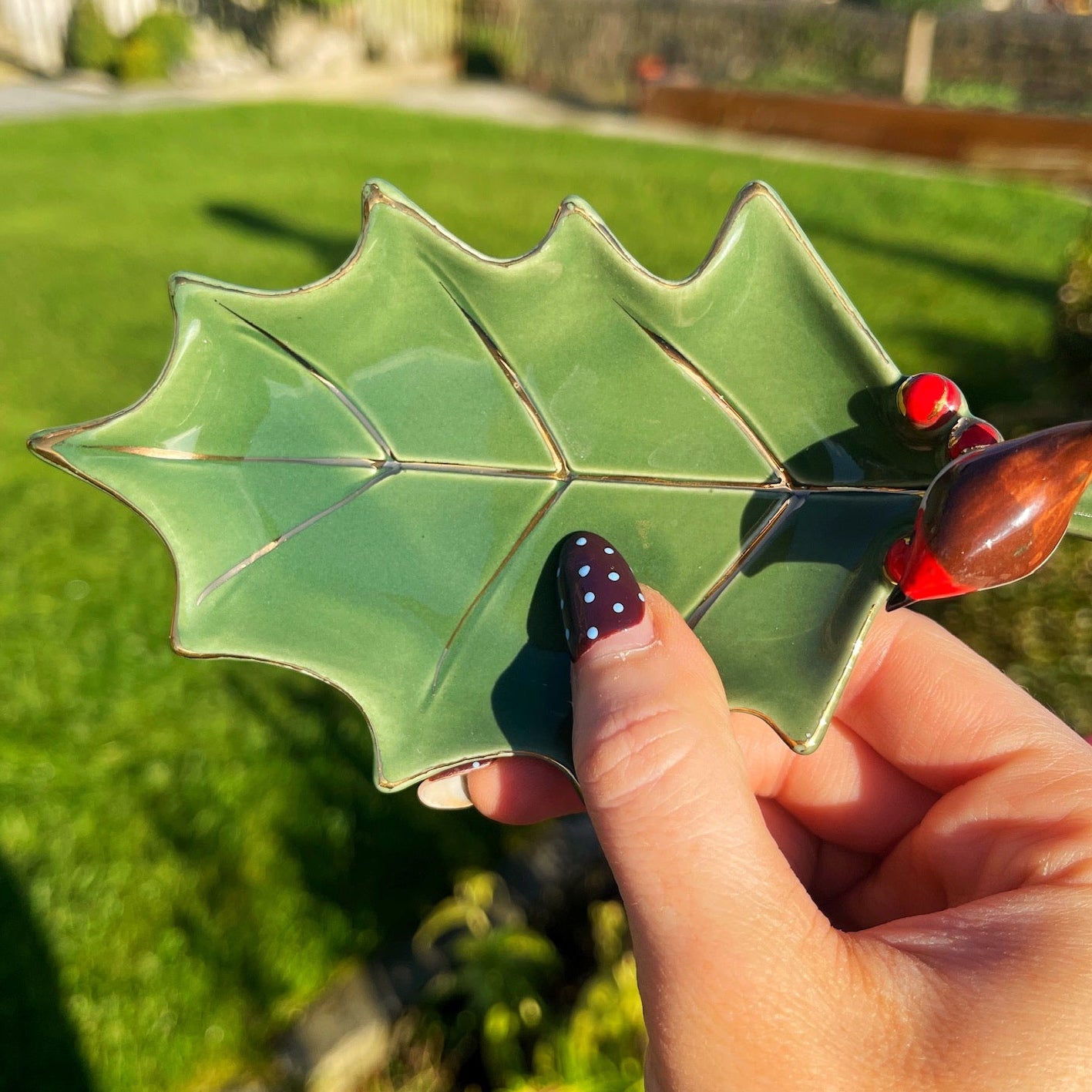 This charming Ceramic Holly Leaf Trinket Dish brings a festive touch of nature to your home. Shaped like a holly leaf with elegant gold detailing, it features a sweet little robin perched at the end, adding warmth and character to the design.