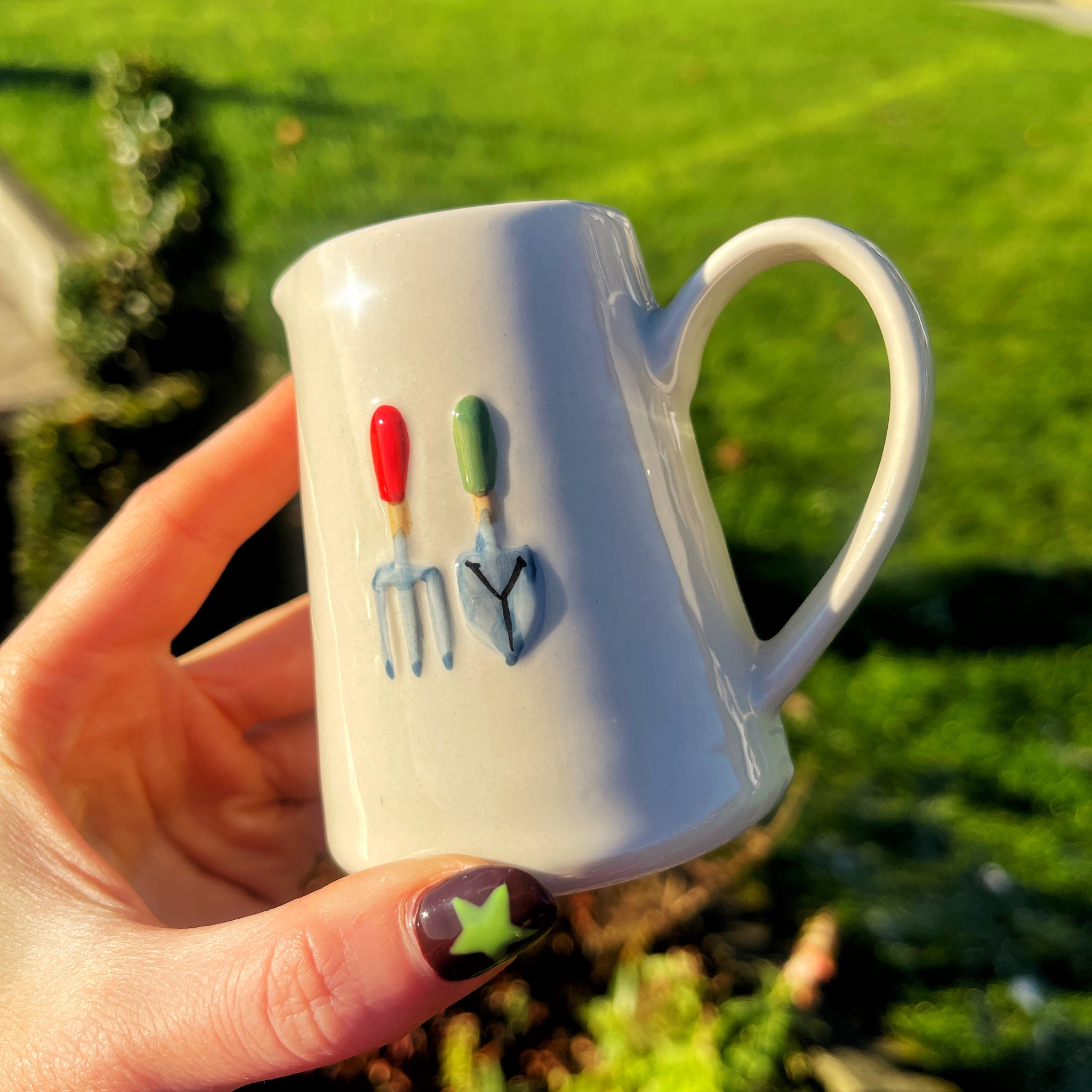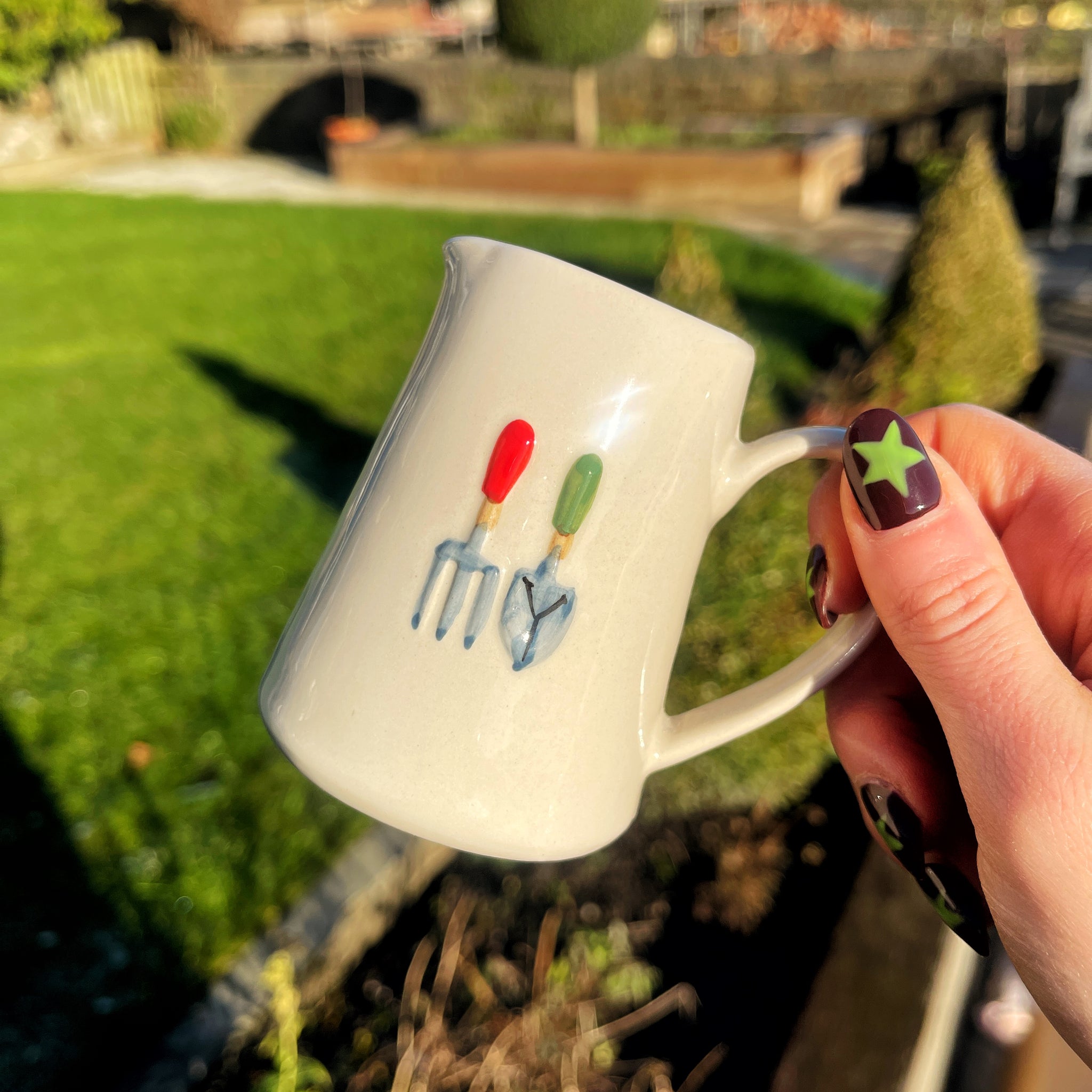 Celebrate the charm of gardening with this ceramic small milk jug, beautifully embossed with a sweet shovel and trowel design. Standing at a petite size that's perfect for serving milk or cream, it brings a gentle rustic elegance to your breakfast table, coffee tray, or afternoon tea spread.