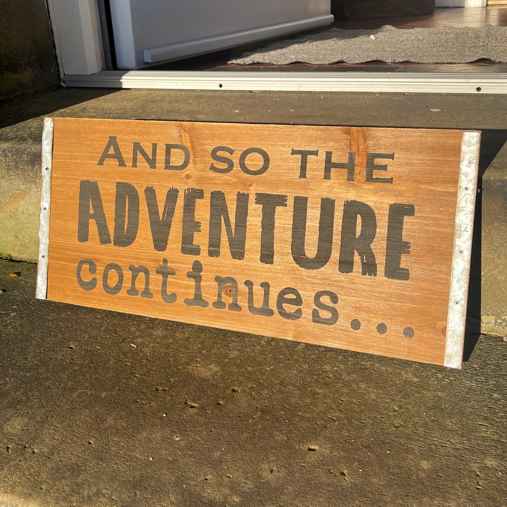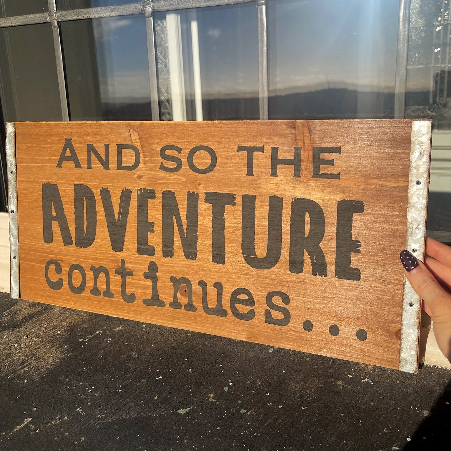 Add inspiration and rustic charm to any space with this large wooden Adventure sign.