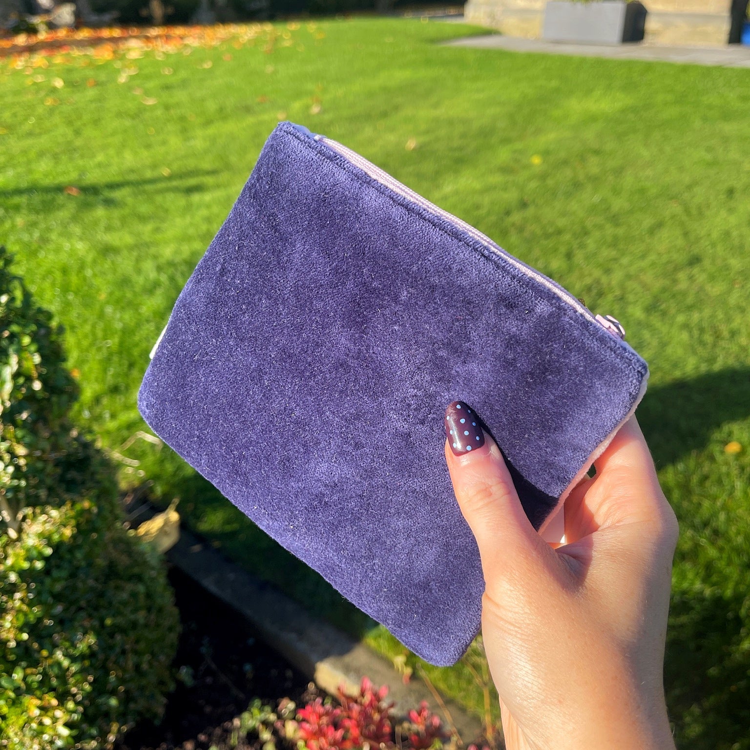 Hand holding a purple suede pouch outdoors with green grass and a building in the background