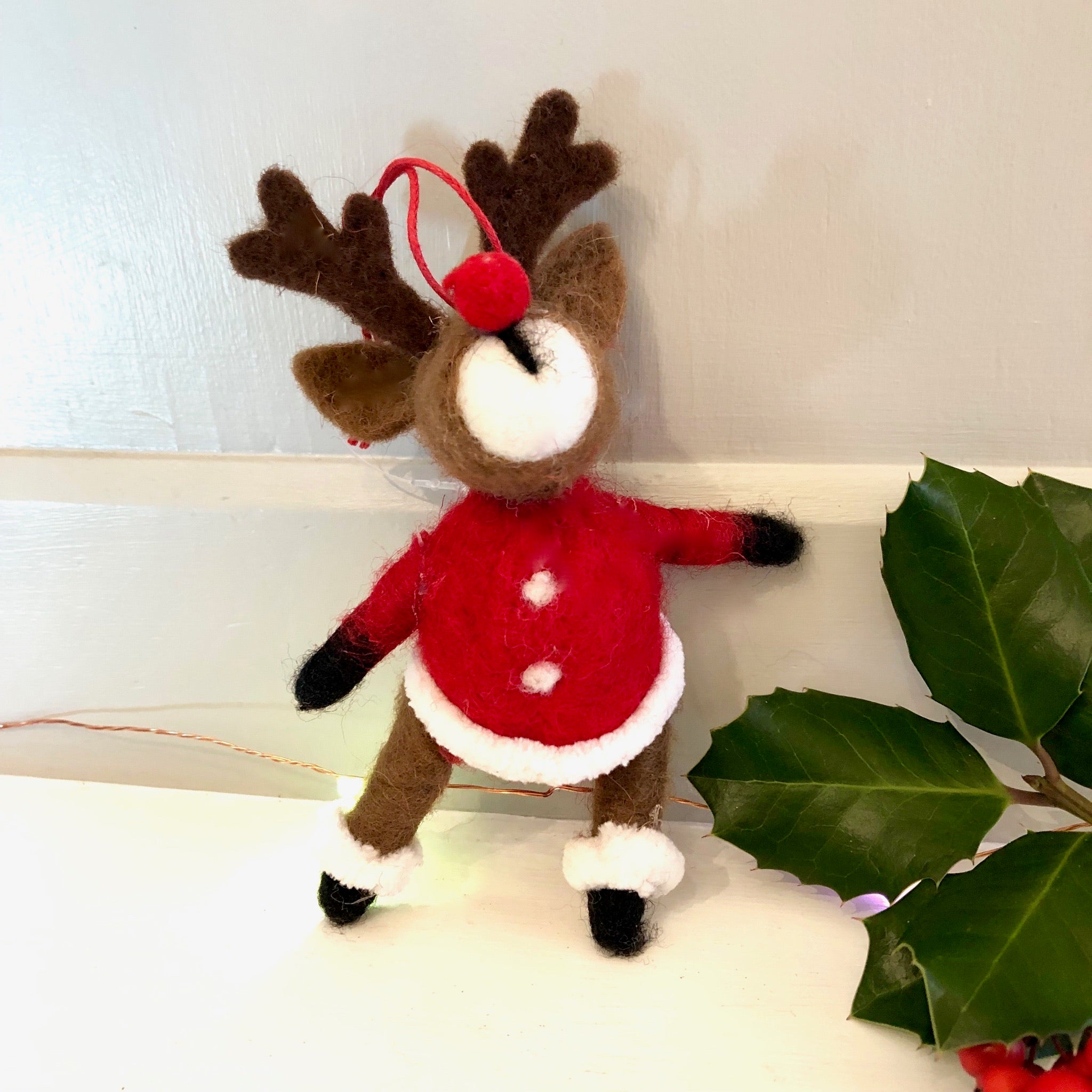 Sweet felt reindeer hanging decoration. He has a pom pom nose and felt antlers. Also a red tunic with white detailing.