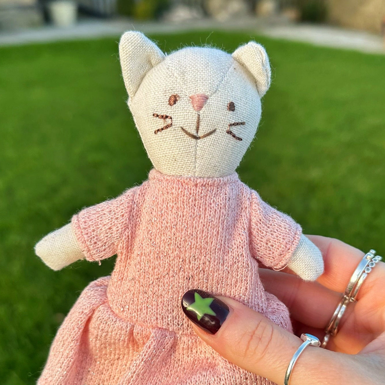This adorable linen girl cat wears a soft pink knitted dress, adding a gentle, cosy charm to her character.