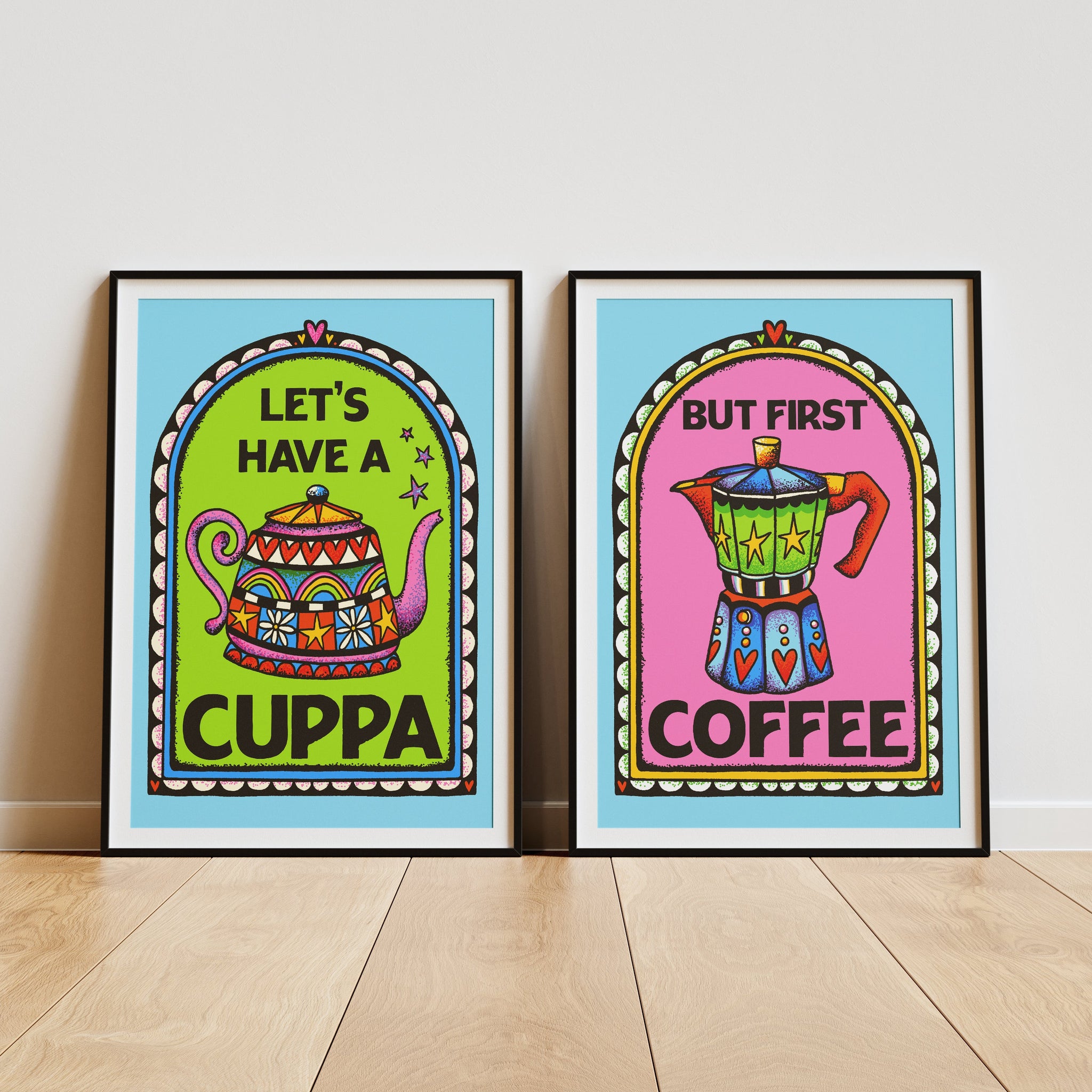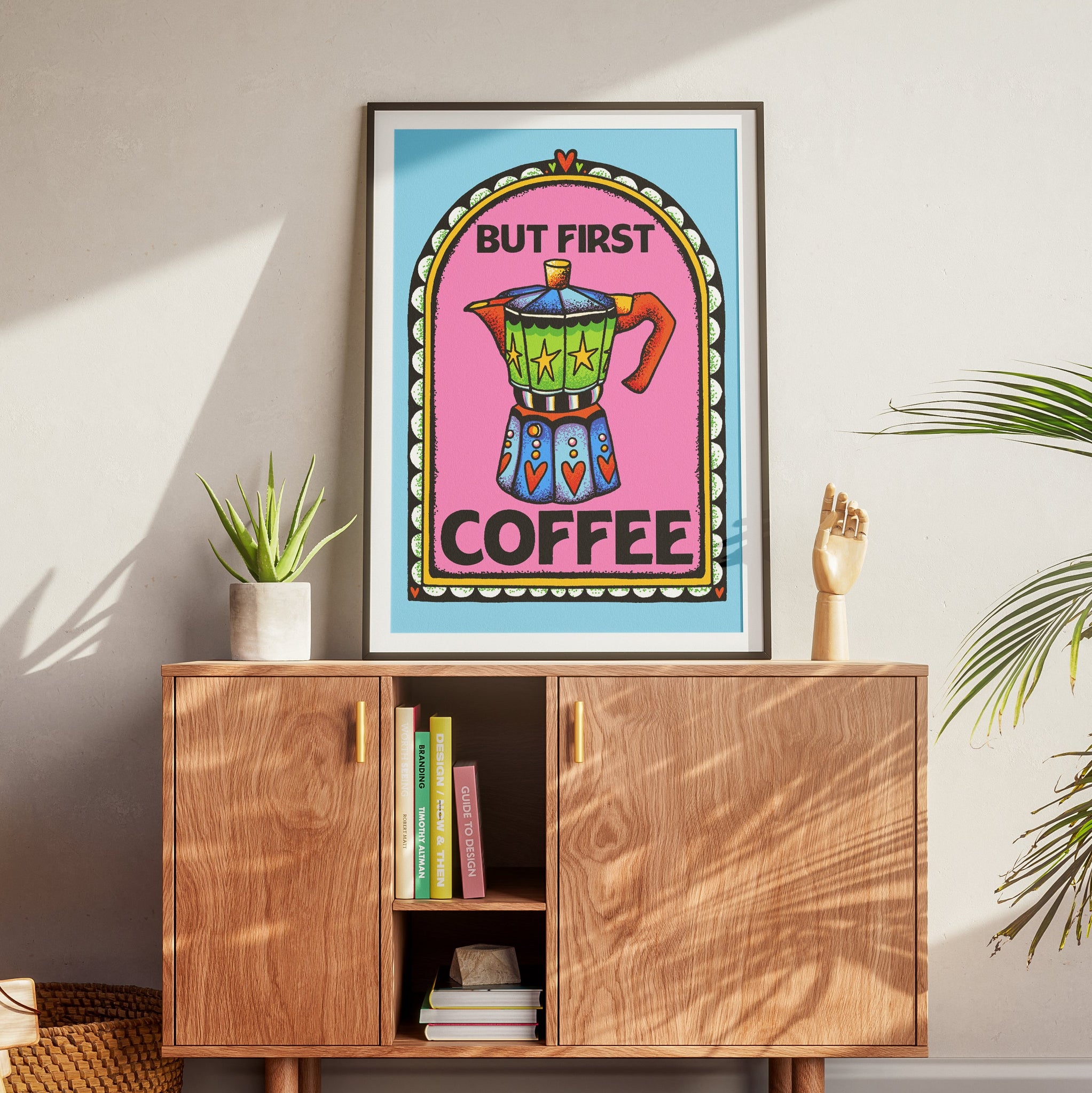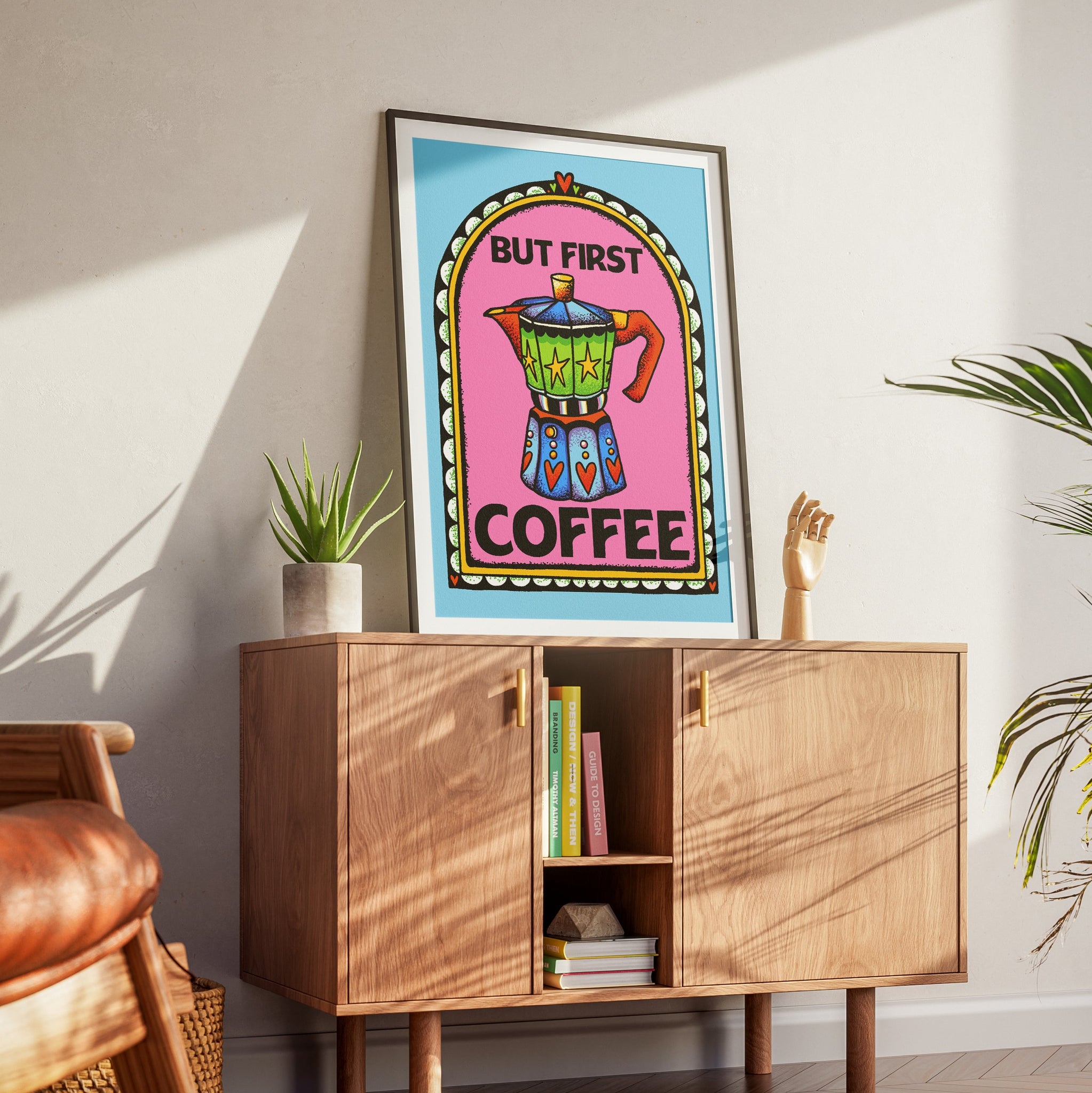 Start your day in style with this eye-catching satin finish print, featuring a traditional coffee pot and the much-loved phrase “But First, Coffee.” Set against a striking blue and pink background, the bold, funky colour palette gives this piece a playful yet stylish feel, perfect for kitchens, coffee stations, or breakfast nooks.
